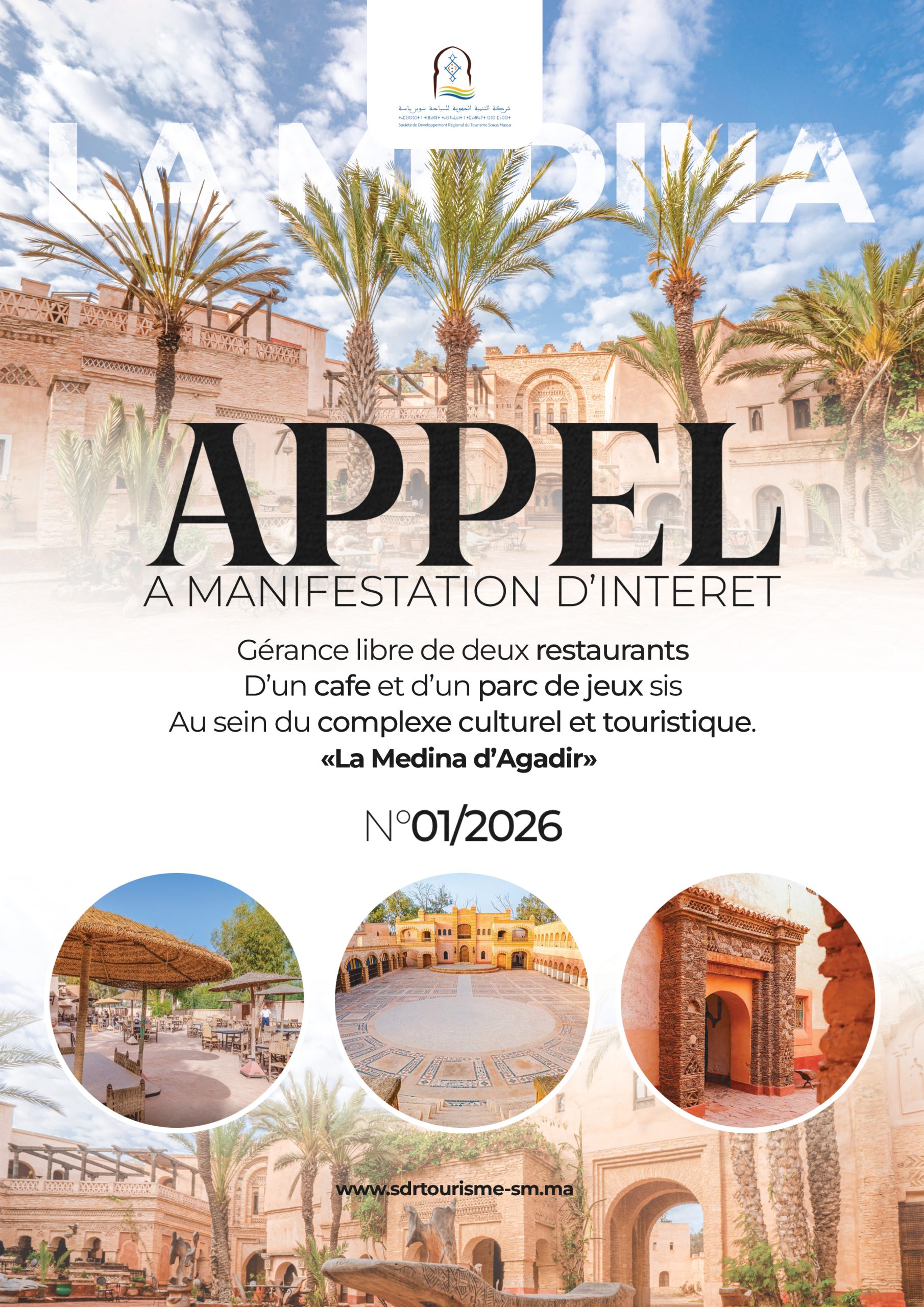 La SDR Tourisme Souss Massa lance un Appel à Manifestation d’Intérêt pour la gérance libre de deux restaurants, d’un café et d’un parc de jeux au sein du complexe « La Médina d’Agadir », site à forte valeur touristique et économique.